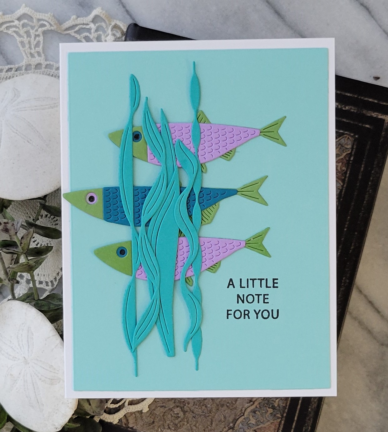 Hello everyone! Rosemary here on the blog today. Can’t believe it is already October! 2025 is definitely flying by, lol! I’m sharing a card today that I created with the fun Block Print Sardines and Sea Kelp and Mini Fish die sets. Let’s look at what I made.