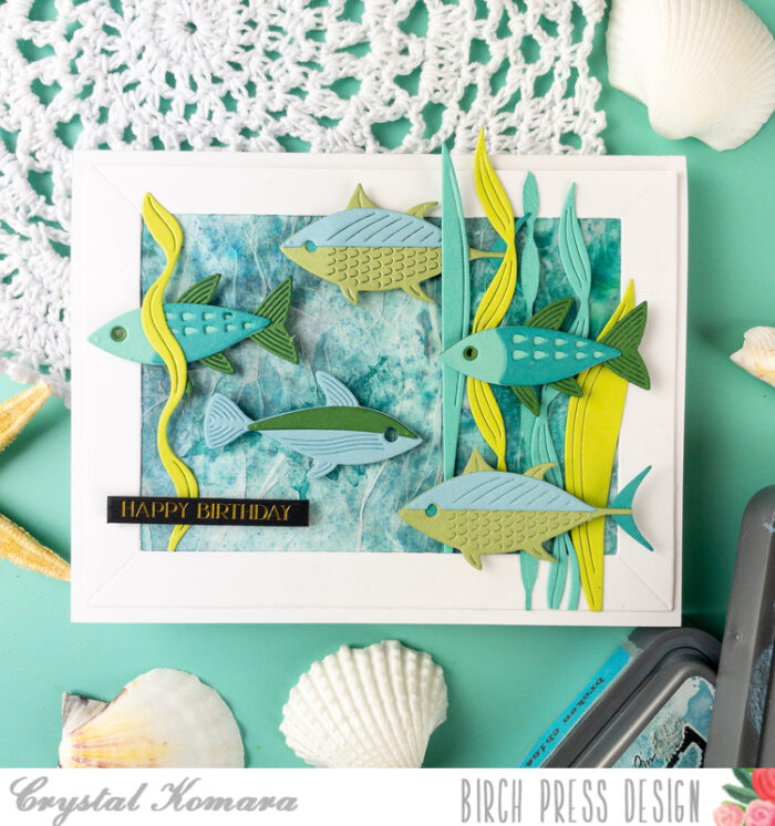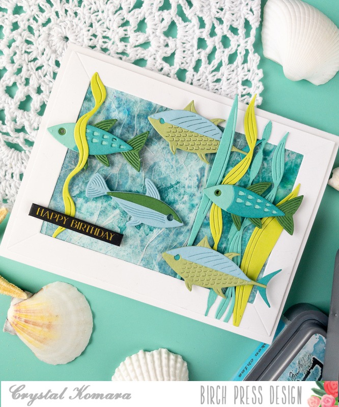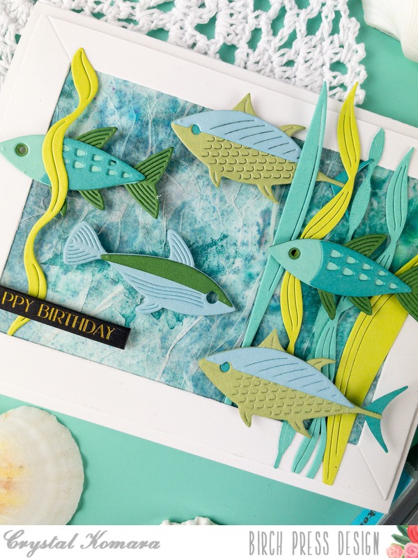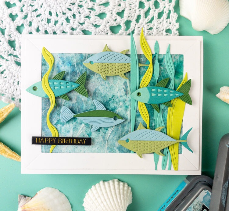 I adhered all of the fish to the card using 3M foam adhesive for added dimension and then lastly, I added a tabbed foil sentiment (from sister company Memory Box) to the card.