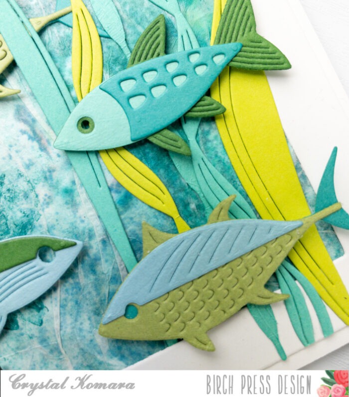Using the Block Print Swimmer Fish and Block Print Ocean Fish, I cut them from various shades of blue and green cardstock and then began adhering all the fish pieces together randomly just mixing and matching. I also used the Sea Kelp and Mini Fish dies and cut cardstock in another shade of blue and green. I kept the colors very monochromatic for this card.