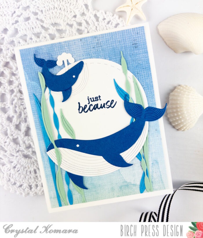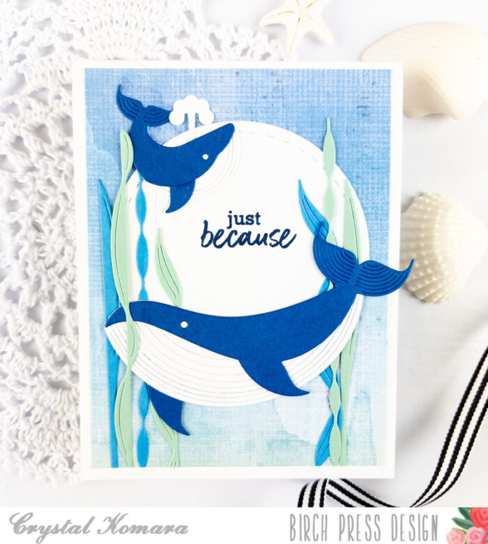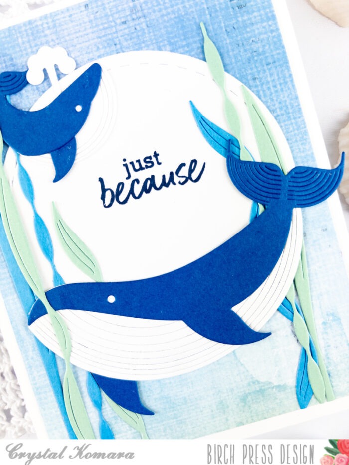 Using the Block Print Majestic Whale and Block Print Whale duo, I die cut the whales from a navy blue cardstock and white cardstock. I used a liquid adhesive to adhere the components together and then once the whale pieces were assembled, I added the whales to the card using 3M foam adhesive for added dimension.