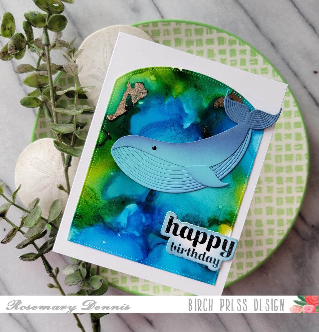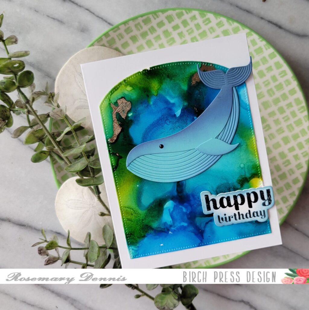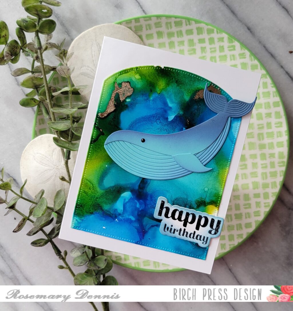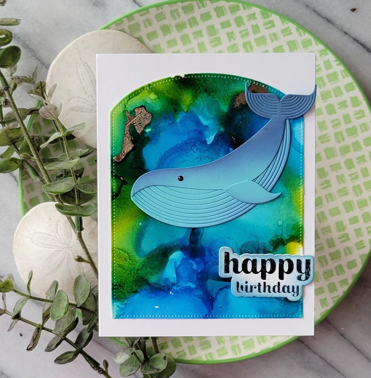 I die cut the whale from a light blue Memory Box cardstock and then added distress oxide ink in Chipped Sapphire ink to darken up tail and top portion of the whale. I added a little bit to the belly and fin, as well. Then I adhered everything together. Before the alcohol ink had completely dried I added a little touch of gold using a foil sheet in rose gold. Then I die cut the background using a Memory Box arched rectangle die.