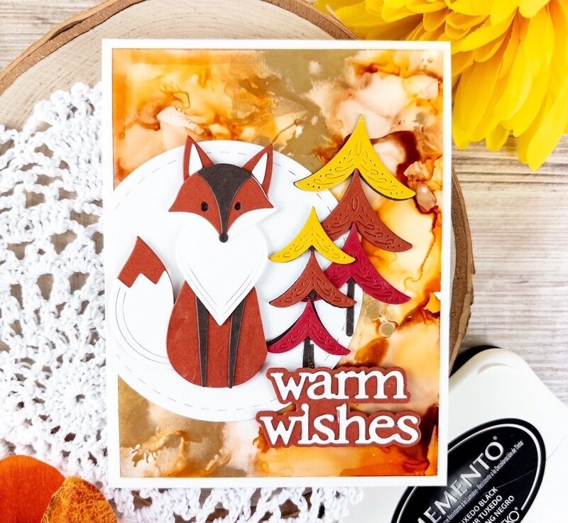 The base of this A2 sized card is made from 110 lb. Neenah Solar White Smooth cardstock. For the first layer, I pulled from my own stash of pre-made alcohol ink backgrounds and used a copper and orange colored print that I thought would made the fox well.