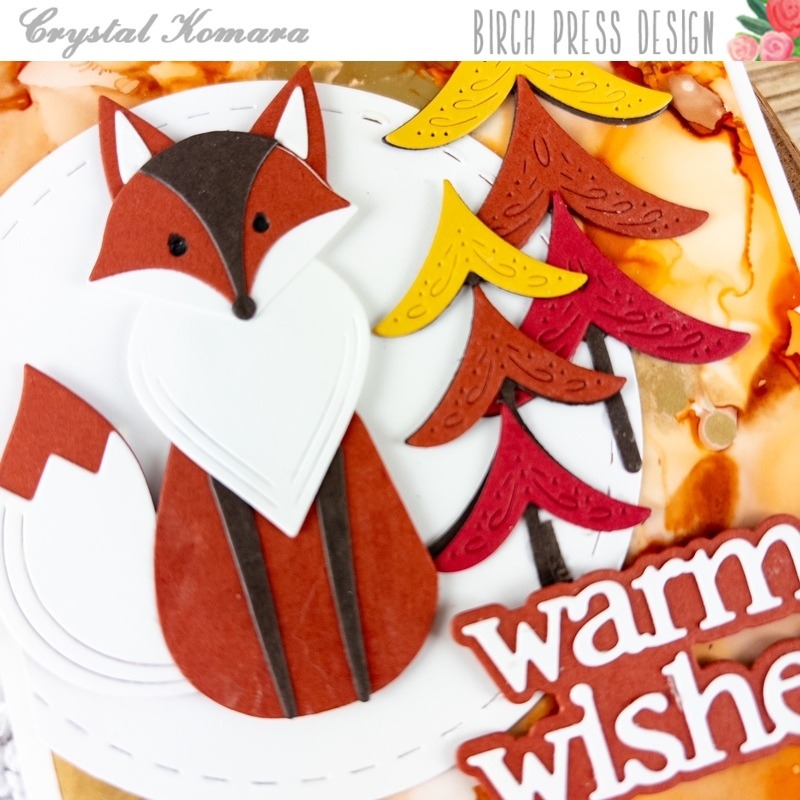 I adhered the fox and the trees to the card using more fine-tip liquid glue and lastly I adhered the sentiment using the Warm Wishes vintage sentiment. I adhered the sentiment to the bottom right of the card using 3M foam adhesive for added dimension.