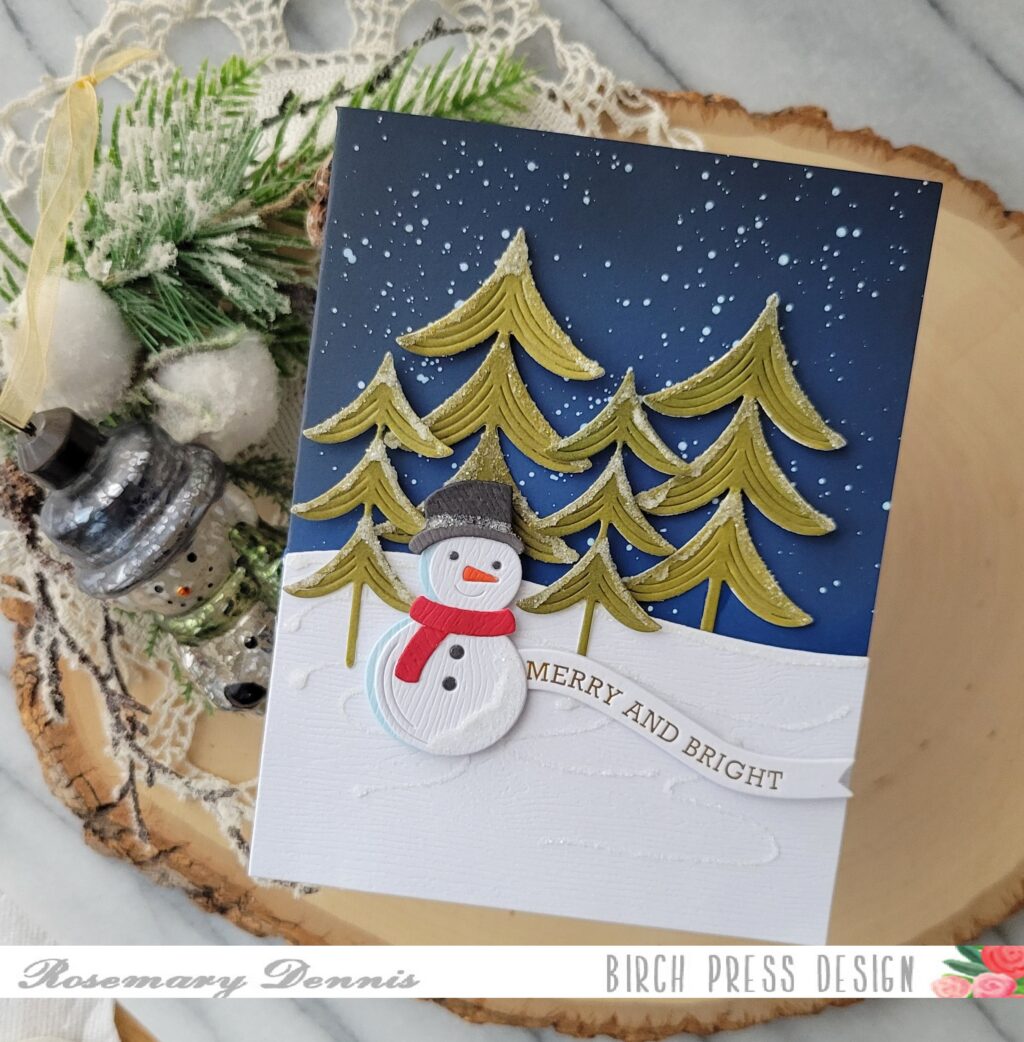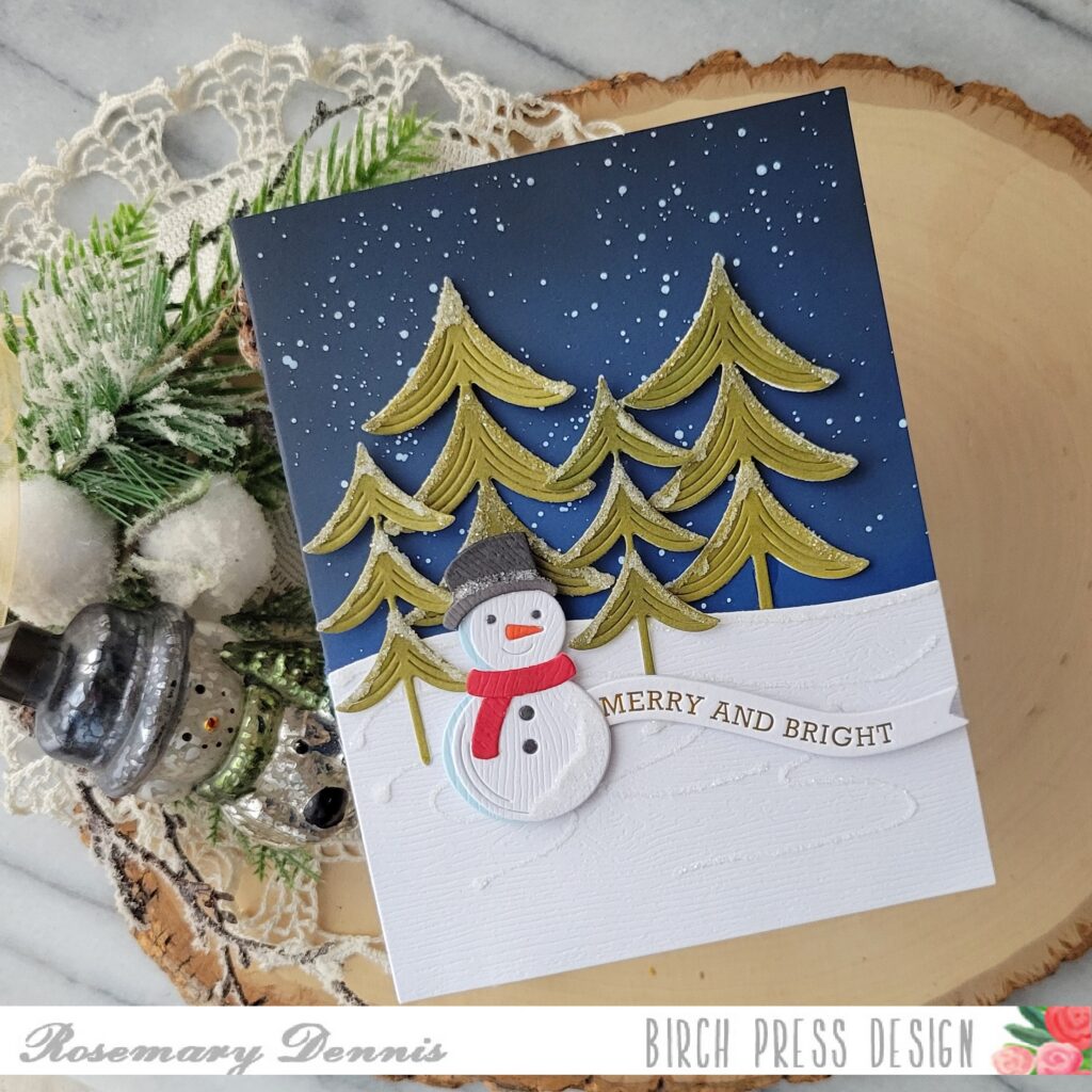 Hello! I hope everyone in the US had a wonderful Thanksgiving. Can you believe that Christmas is just a few weeks away? I can’t! I’m still making Christmas cards. Today I’m sharing one that I made using the new Block Print Debonair Snowman and Block Print Evergreen Trees die sets. Let’s have a look at what I made.