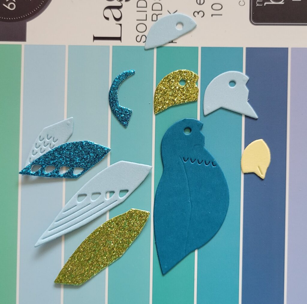 You can see all the pieces of my bird laid out above. I used cardstock from the Memory Box Lagoon 6×6 pad, as well as glitter cardstock from my stash and a tiny piece of yellow cardstock for the beak.