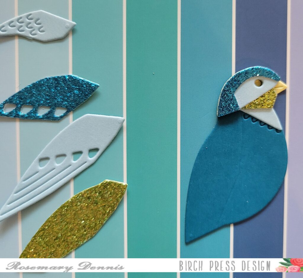 One of the things I like about the packaging for all of the Birch Press Design products is that it shares an image of the finished design in color. This provides you with a great jumping off point for creating your own little bird. I have done that in the past, but this time I decided to use colored cardstock and glitter cardstock to create my little bird. I kept my color scheme fairly simple.