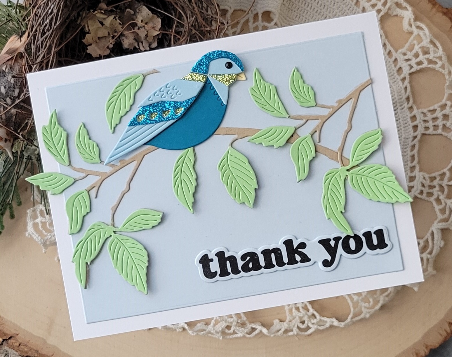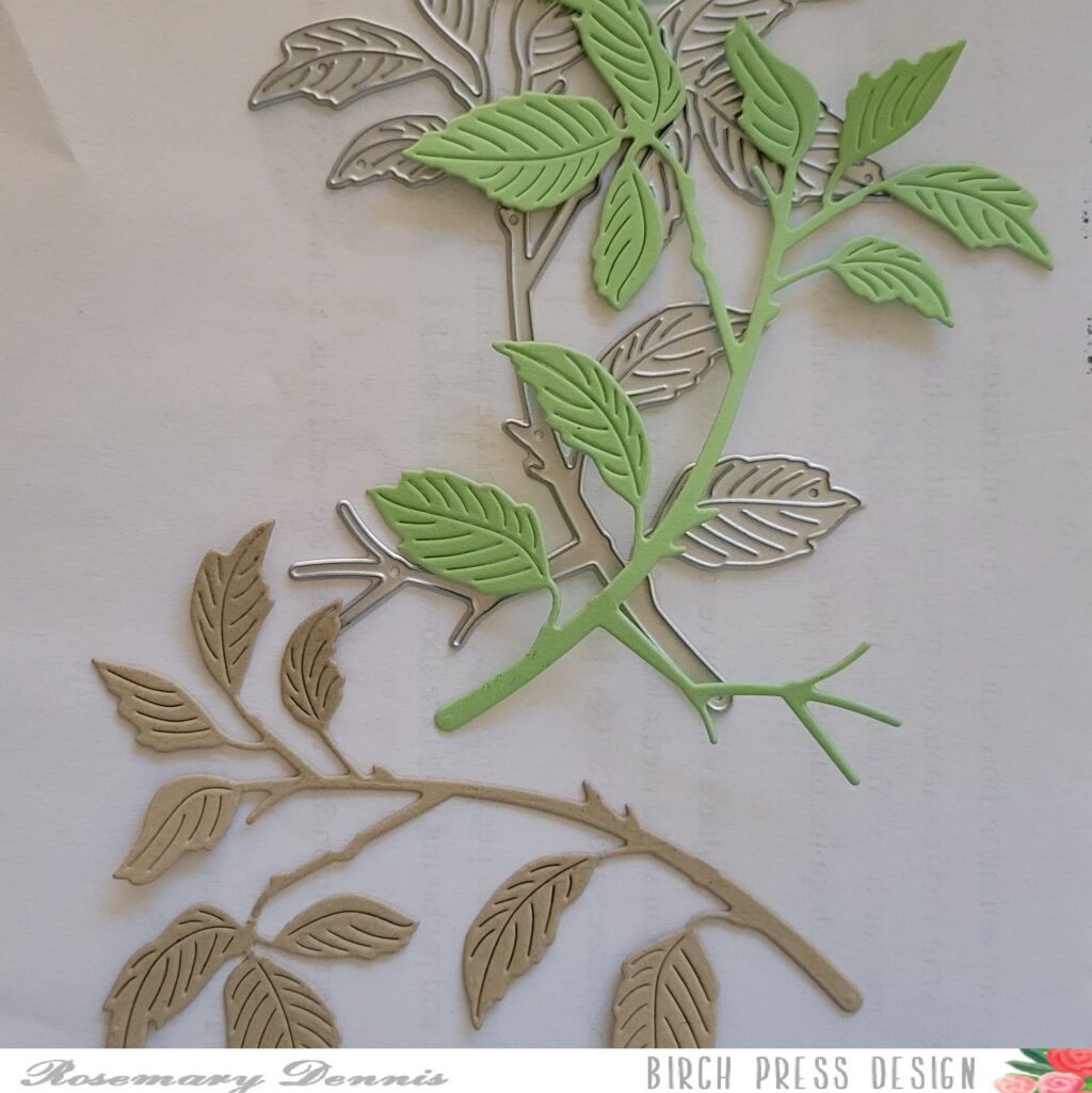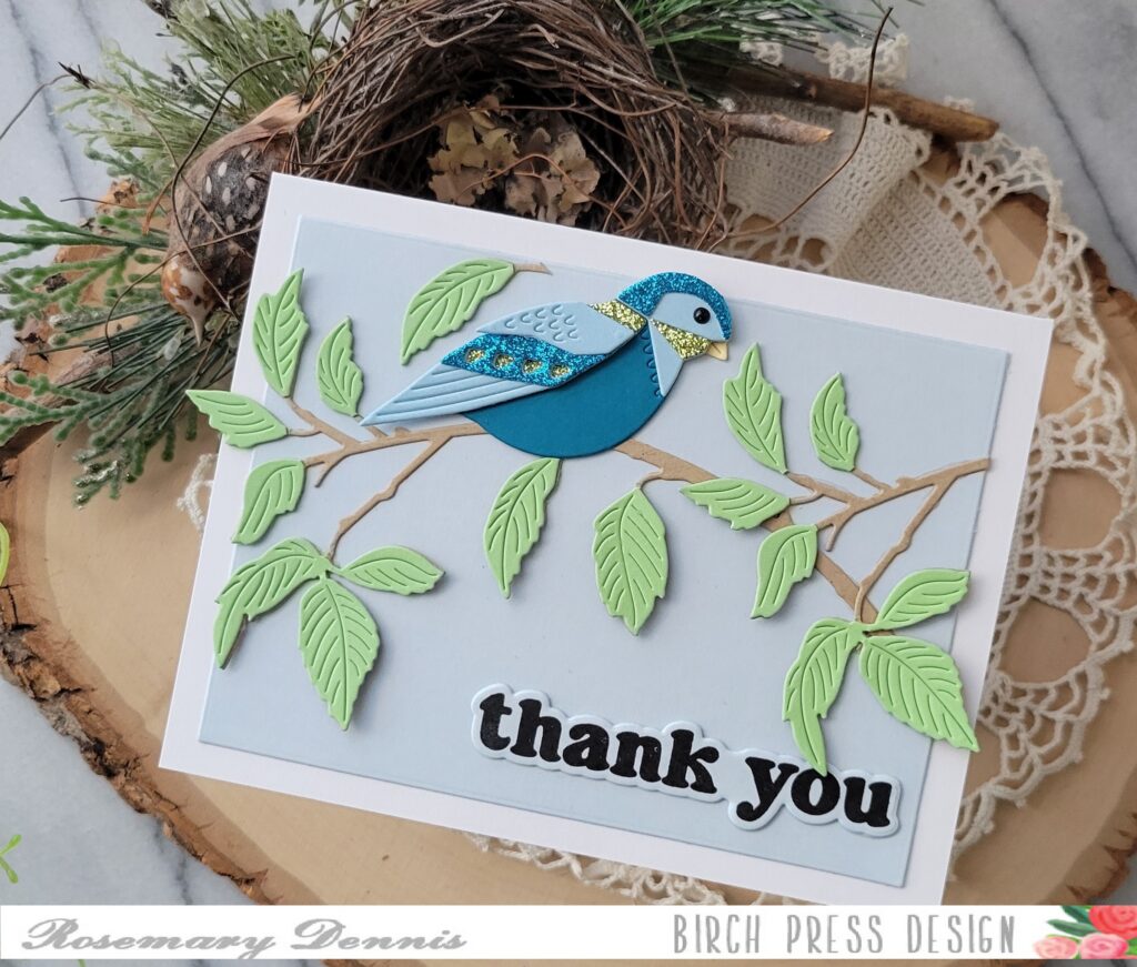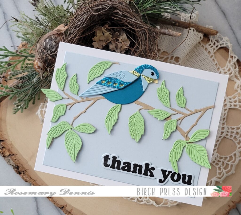 I die cut the branch from kraft cardstock and then from green cardstock. I trimmed the leaves off the green branch and adhered them with liquid glue to the kraft cardstock branch. I did that a second time and then trimmed apart that branch to I could position the pieces as you see. Then adhered my little bird on the branch.