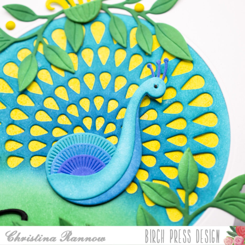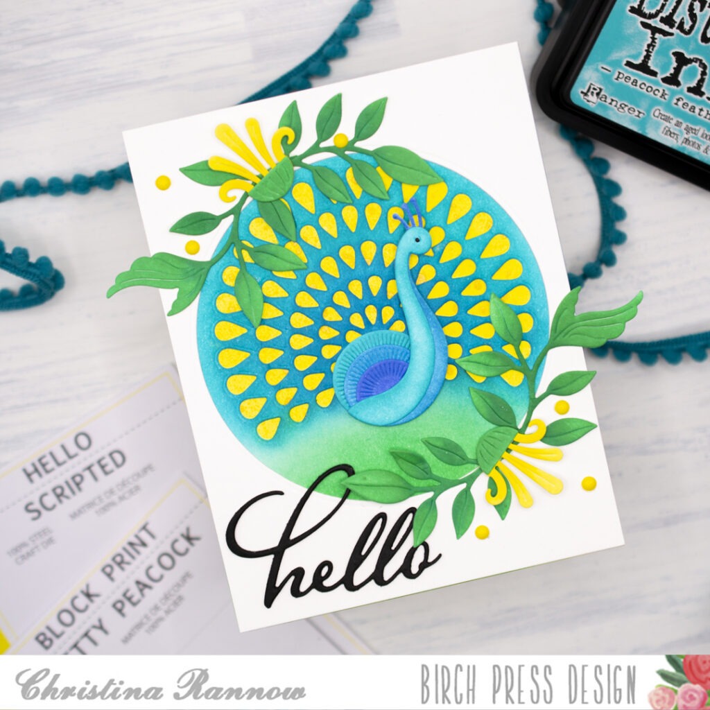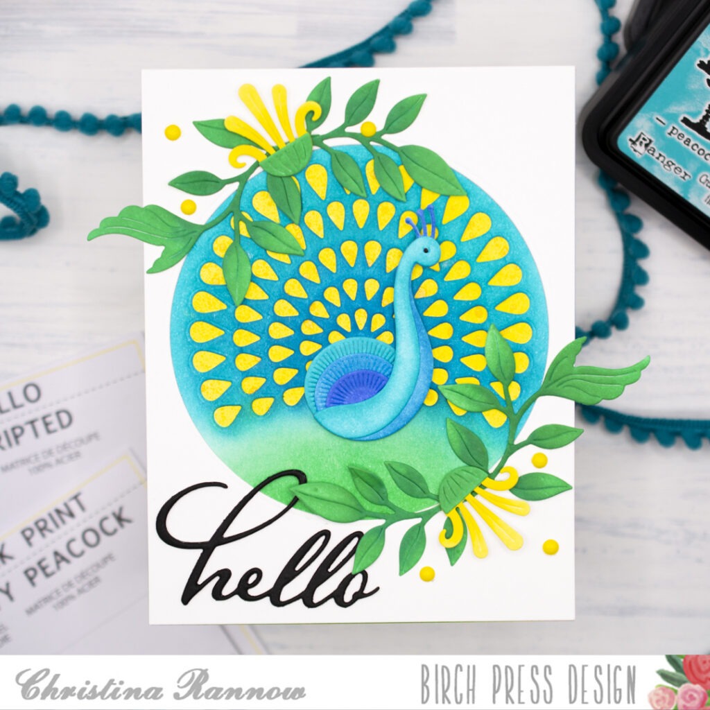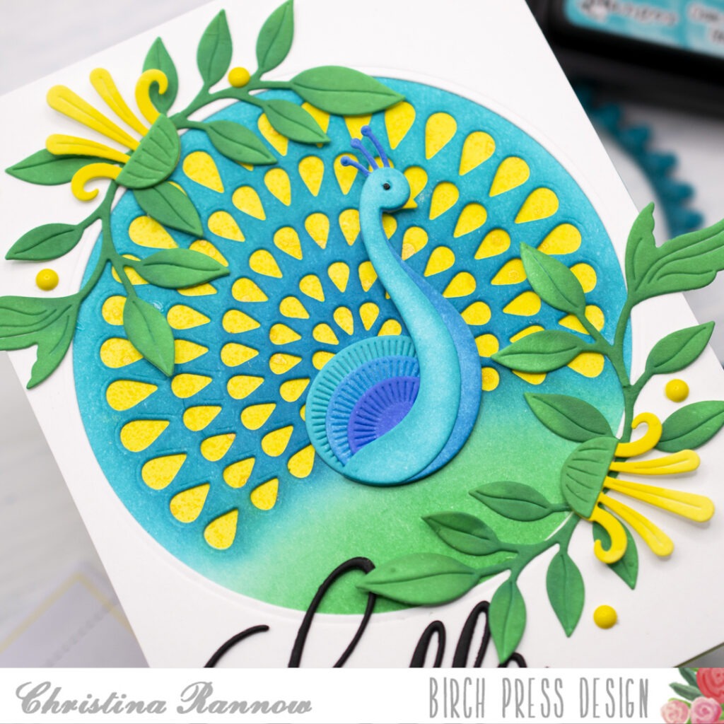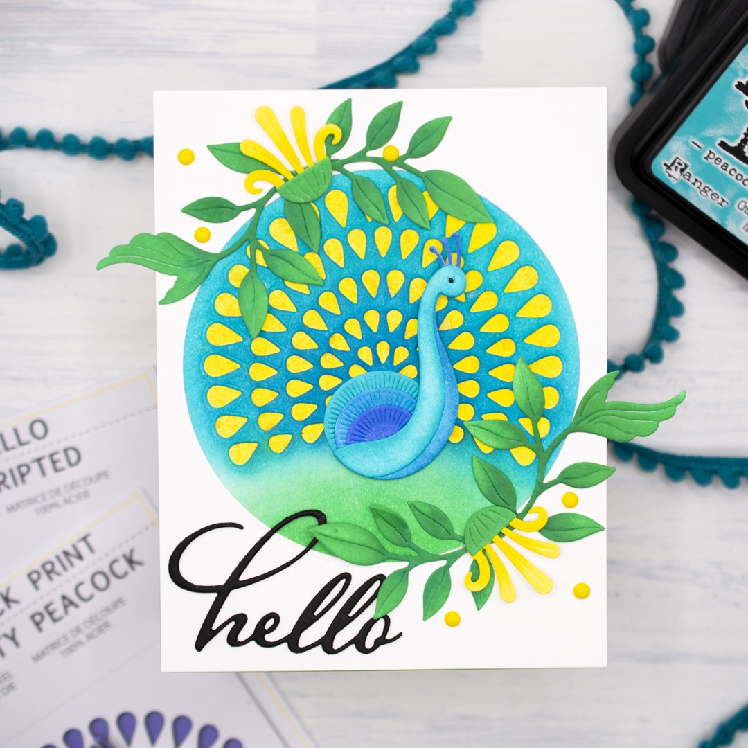 Hello! It’s Christina, and I’m excited to share this vibrant card featuring the unique Pretty Peacock Craft Dies. These dies are unique because the showy display of tail feathers is made up of the small negative spaces after die-cutting them from a cardstock panel. Then you can back the negative spaces with beautiful ink blends, iridescent spatters, or your prettiest cardstock to complete the magnificent display. For this card, I chose a yellow ink blend and a spritz of Distress Mica Stain for a little shimmer. Then I complemented this magnificent bird with some green foliage and pretty blooms. Let’s take a look at how it all came together.