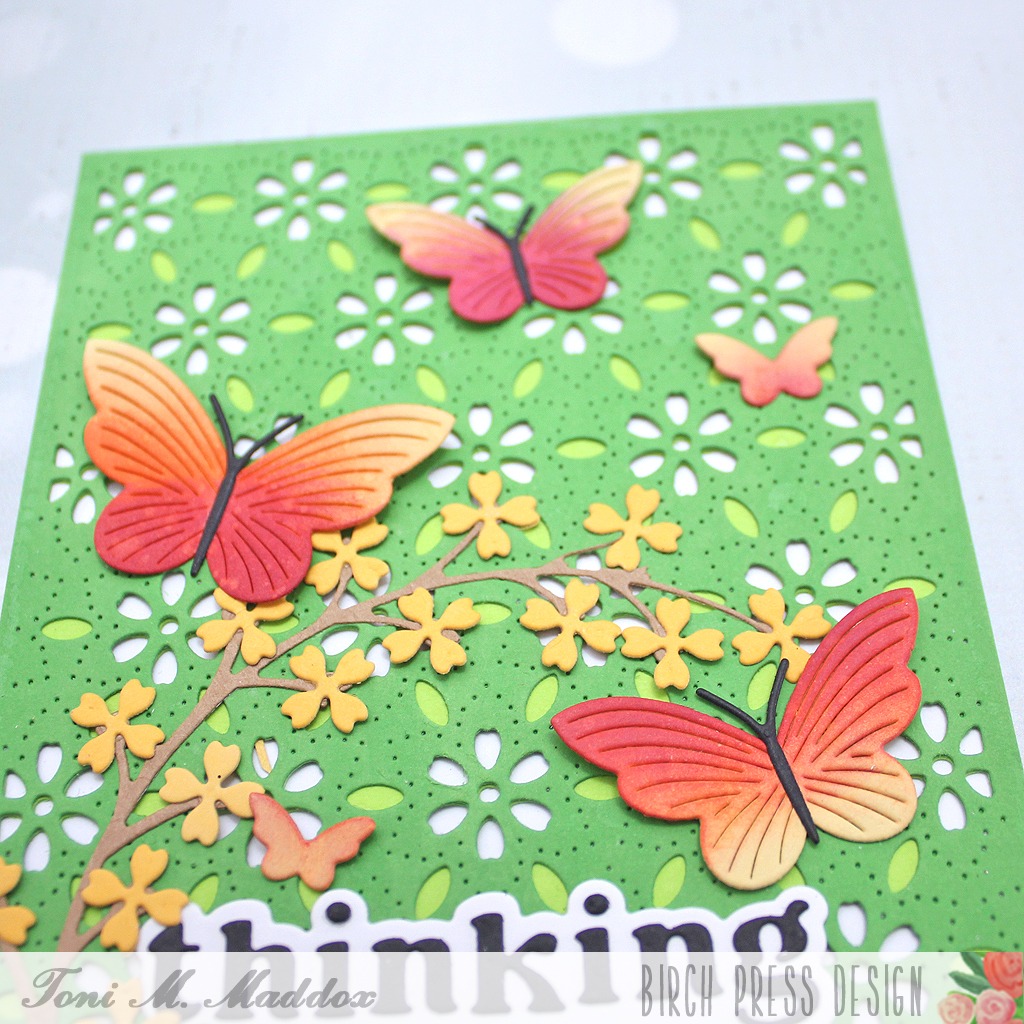 Creating the butterflies might have been my favorite part. I cut the Linear Boho Butterflies from Memory Box Golden Wheat cardstock then sponged them with an orange and magenta ink to create a gradient. They’re so pretty!