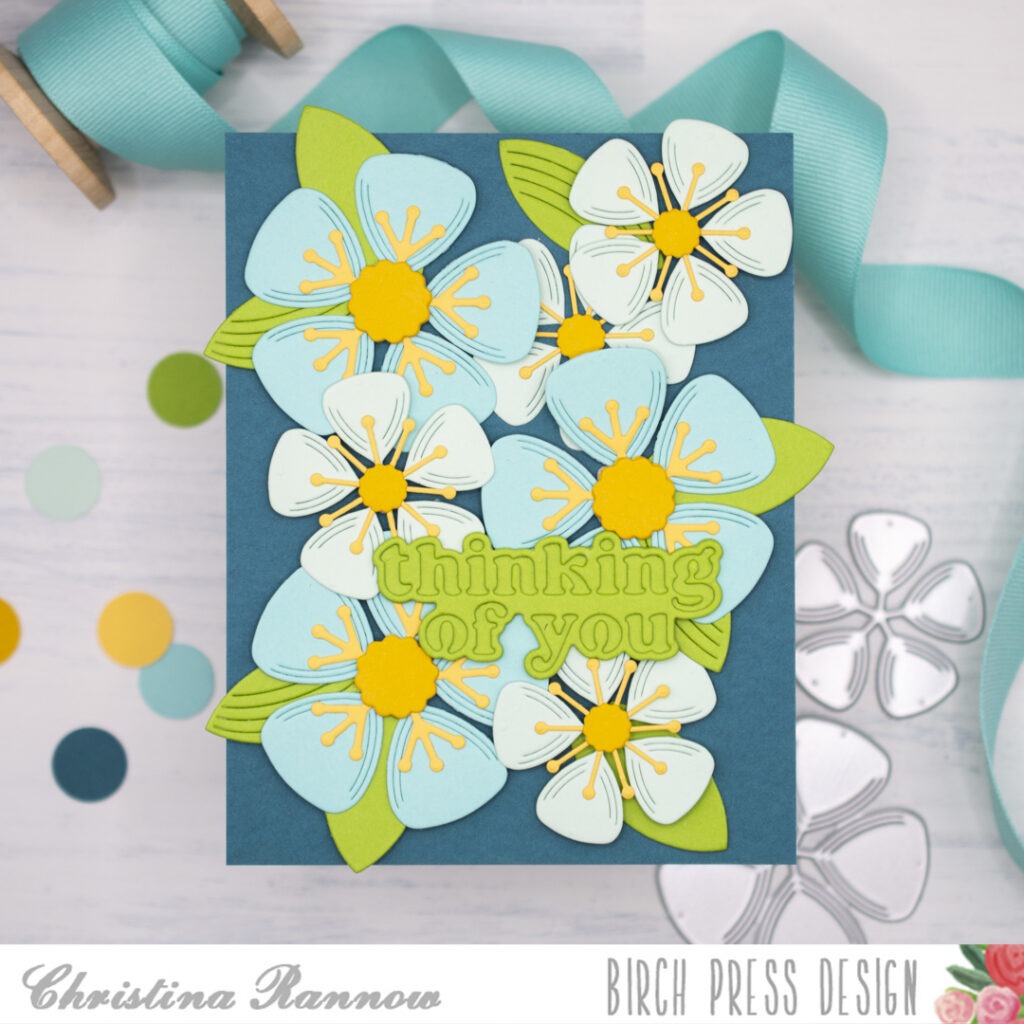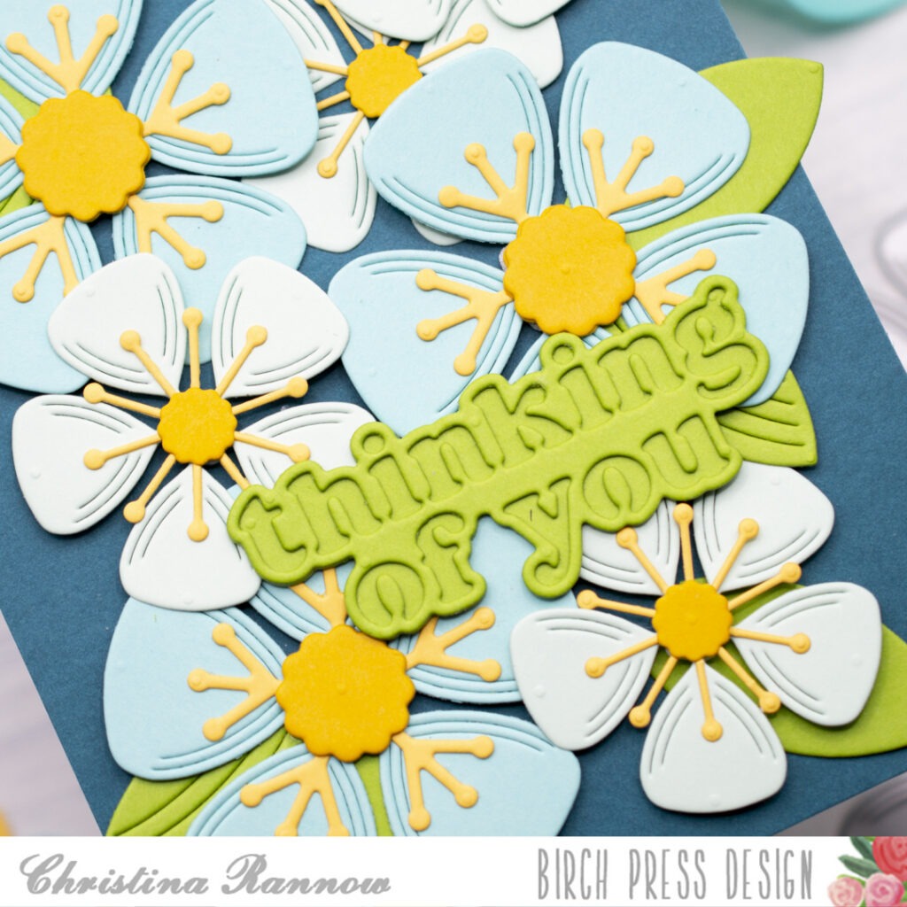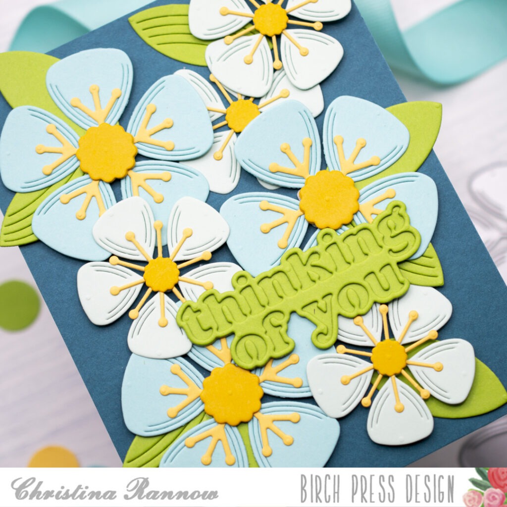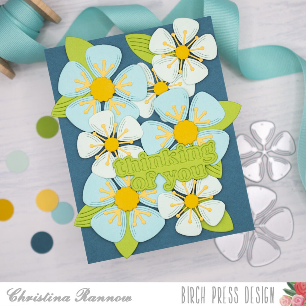 Hello! It’s Christina, and today I’m sharing a bold but simple card that is bursting with beautiful blooms. I chose an analogous color palette of yellow, green, and blue and used the Block Print Lovely Flower craft dies, layering multiple flowers across my card front. I wanted a big bold leaf to match these blooms and settled on using the wing of the Block Print Crane craft dies and finishing with the Thinking of You Vintage Sentiment.