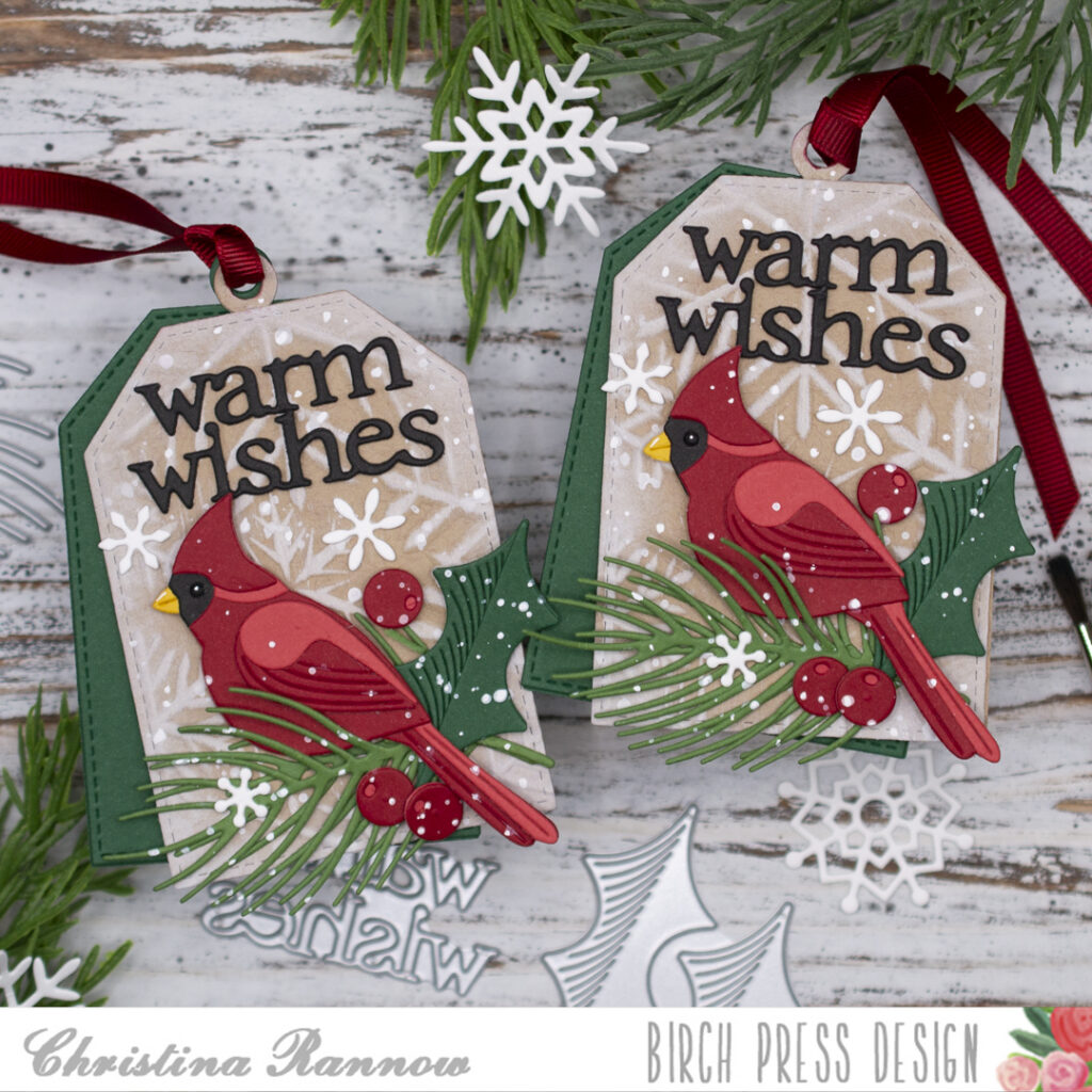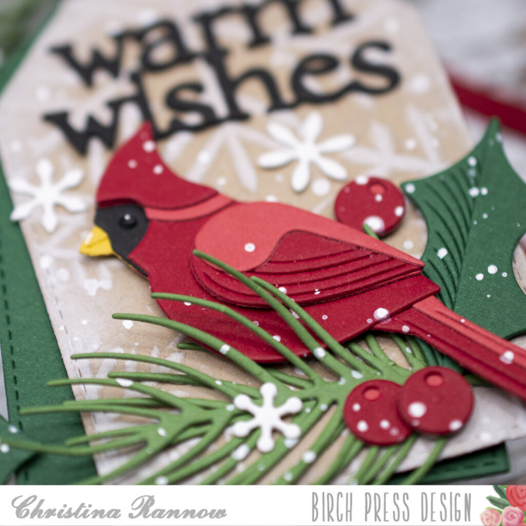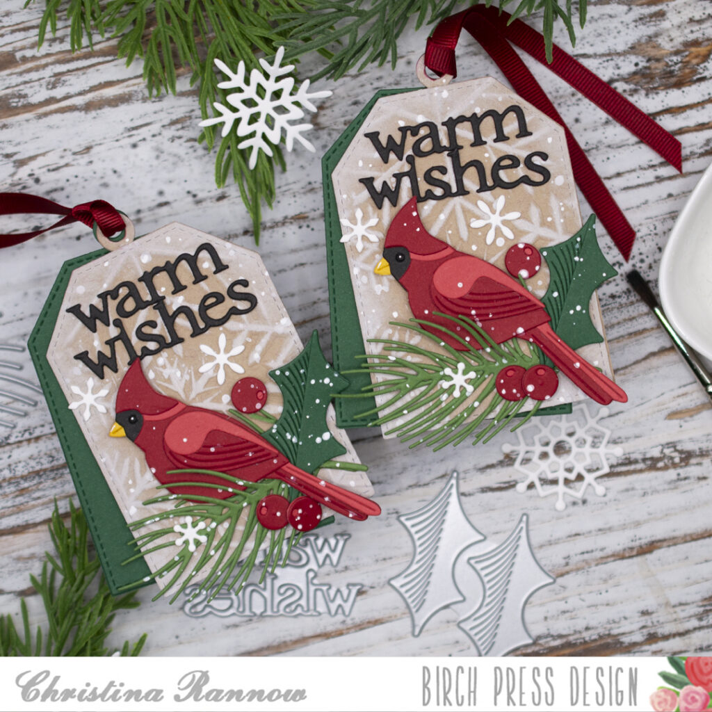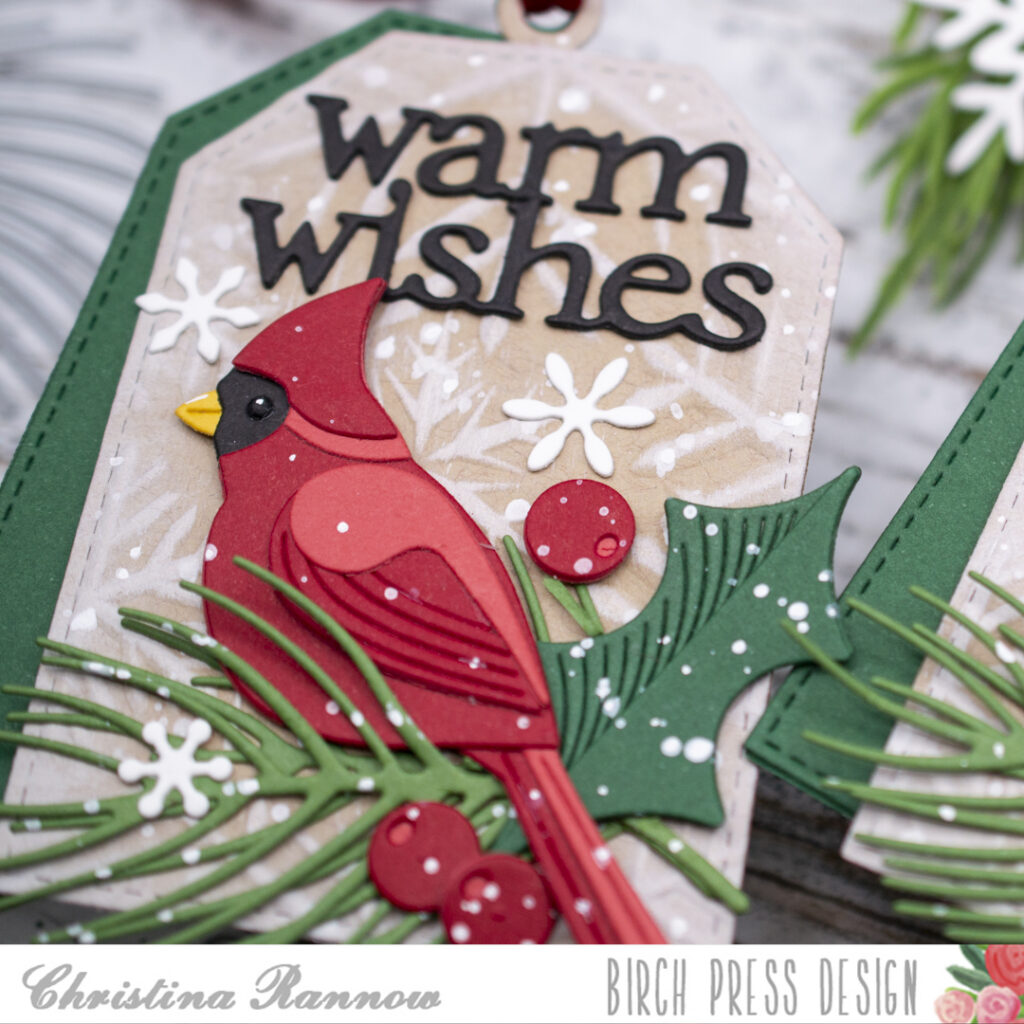 To finish up the tags, I added the die-cut sentiment and a few small die-cut snowflakes. Before looping a ribbon through the tag topper, I layered another tag, this one die-cut from green cardstock, behind the cardinal tag to be used for writing a personal message or the recipient’s name.