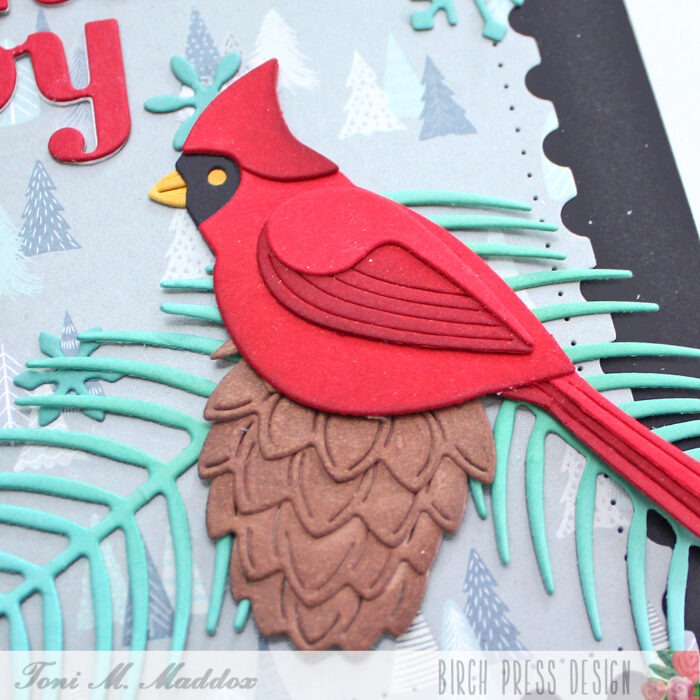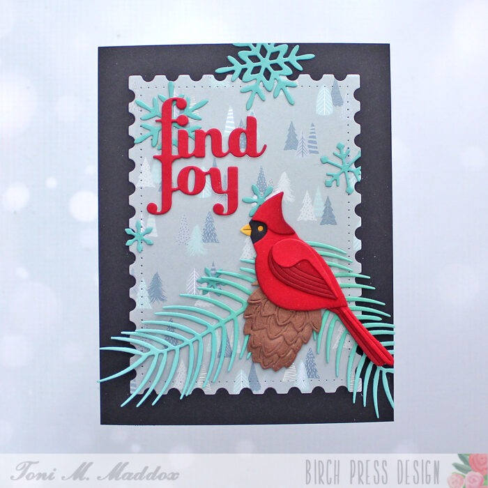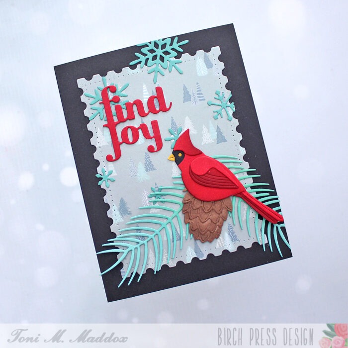 Finally, I added the Find Joy sentiment cut out from the same bright red as the cardinal. That really shows you the difference between shading your diecuts with ink and not doing so.