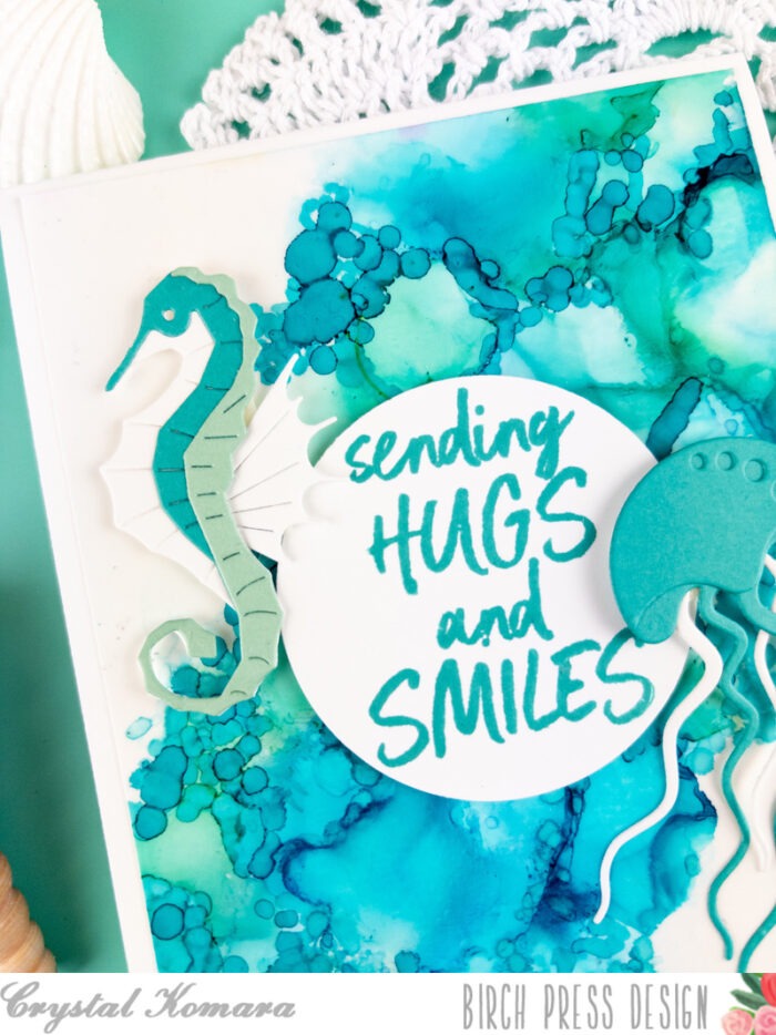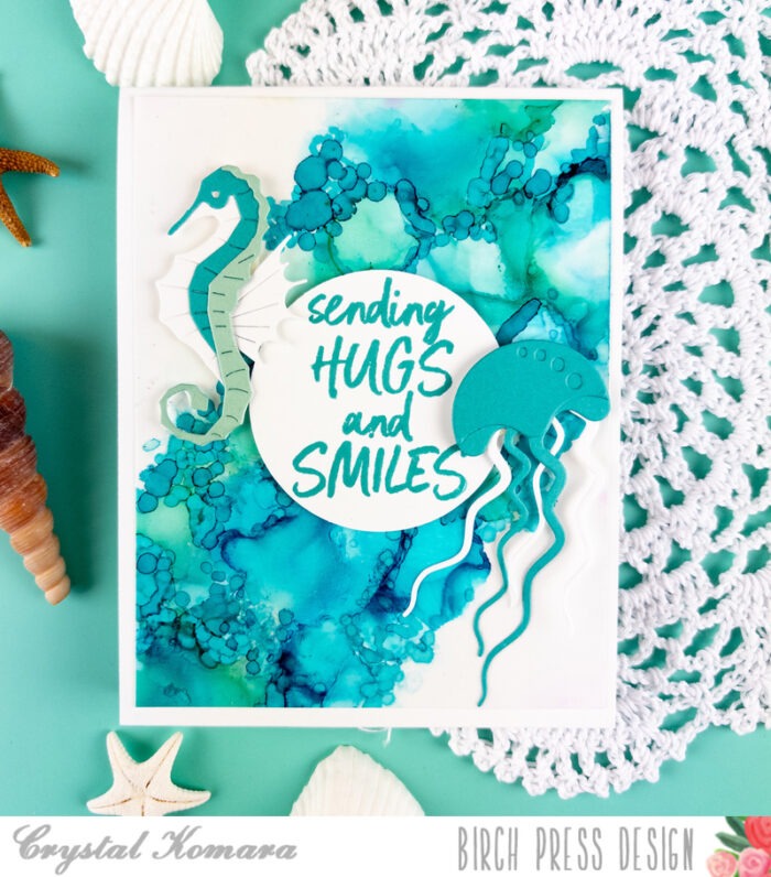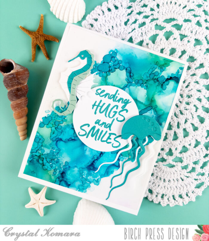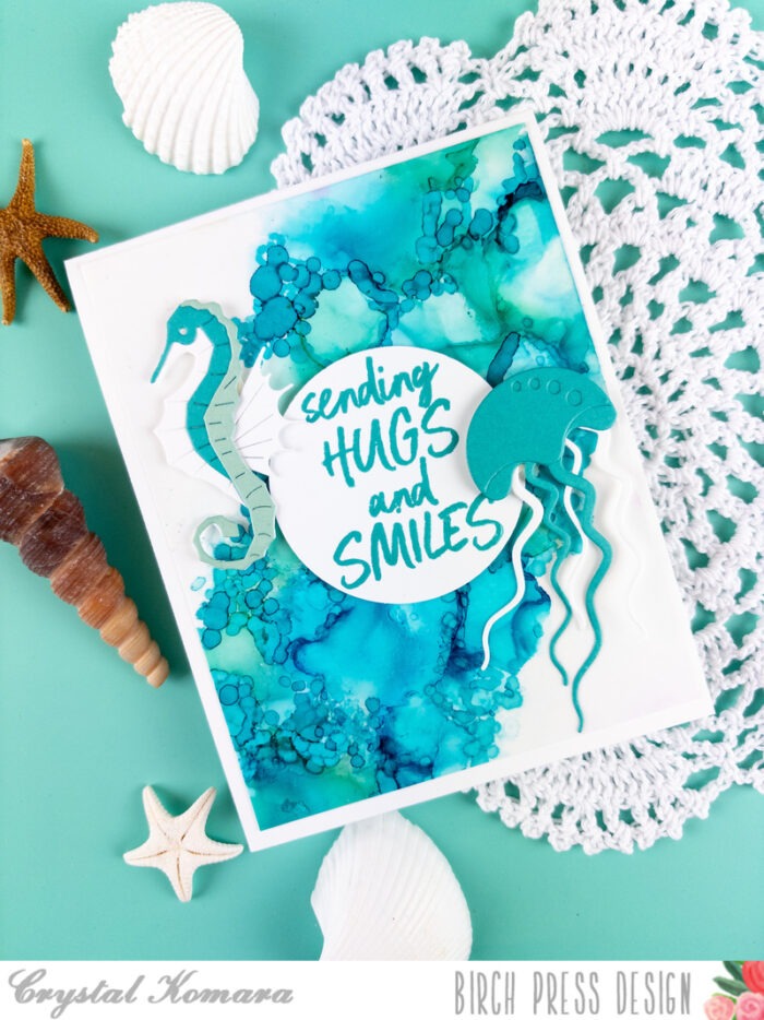 I diecut the Block Print Proud Seahorse, Block Print Floating Jellyfish, and Block Print Dancing Crabs from a few Memory Box cardstocks with shimmery cardstock scraps for highlights.