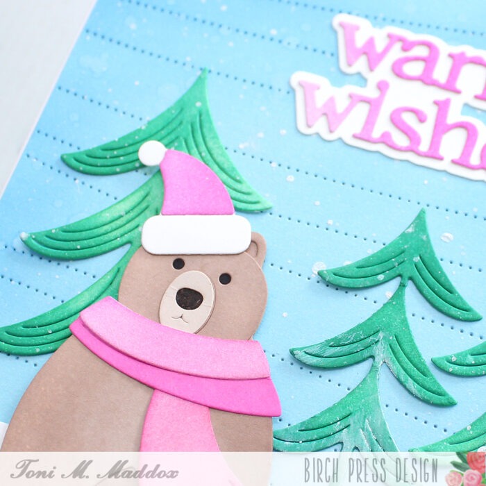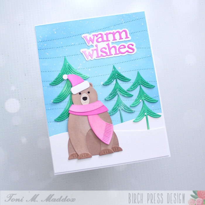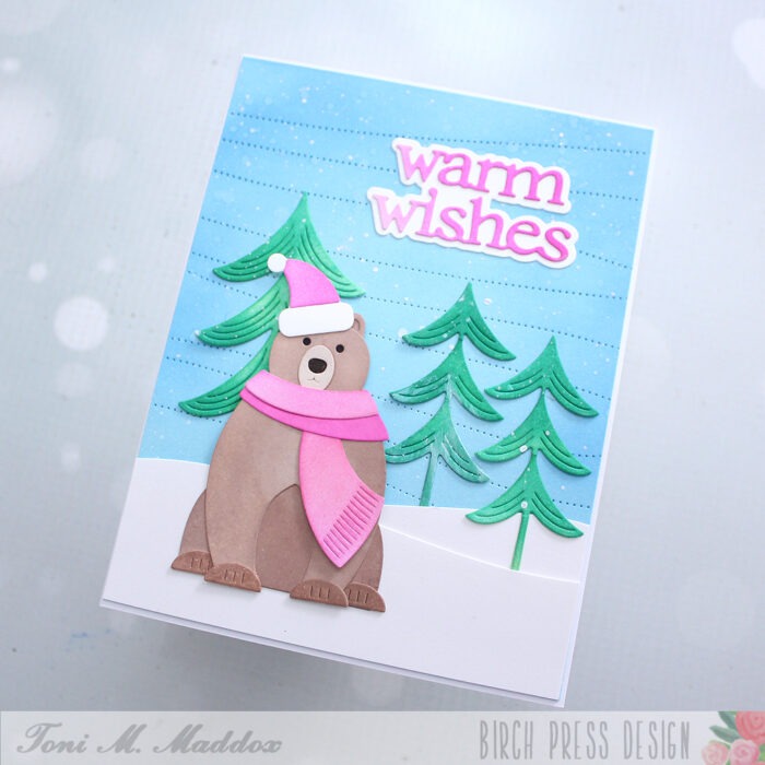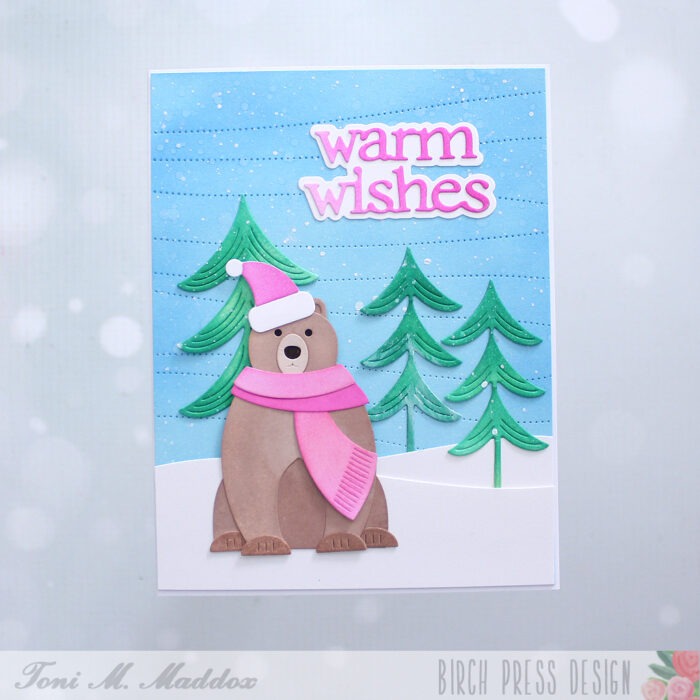 Are you staying cozy this season, my friends? Toni here and I’m loving the cold weather (from inside by the fire cuddling with my cat, of course). For today’s card, we have a winter scene.